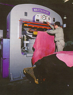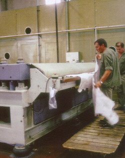 Pushing the leather through cilinders and absorbing bands at high pressures, let us reduce the leather humidity to about 60%, and also extends and prepare the hide for the next steps in the process.